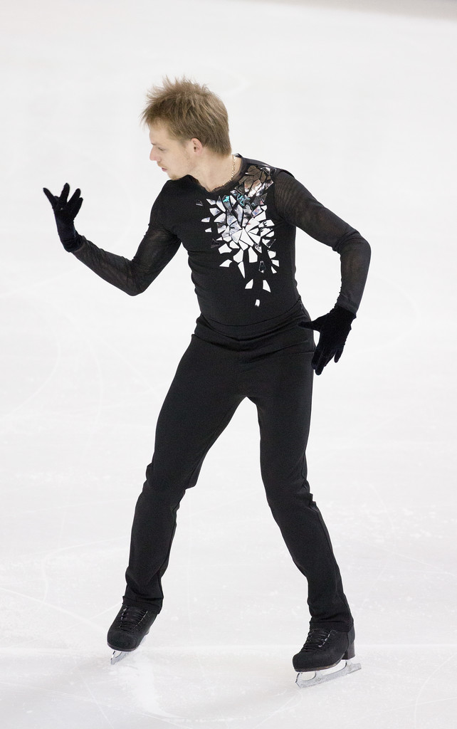 Sergei Voronov Russia Short Program to The Skin I Live In (soundtrack) by Alberto Iglesias: Sergei's costume was a black jersey long sleeve top and pants. I liked the "broken glass" sequin effect on his shirt. It was just the right amount of detail to get my "Great Costume!" attention. I wished he would have continued this detail at the side seam of the pant--using smaller subtler mirrored sequins.