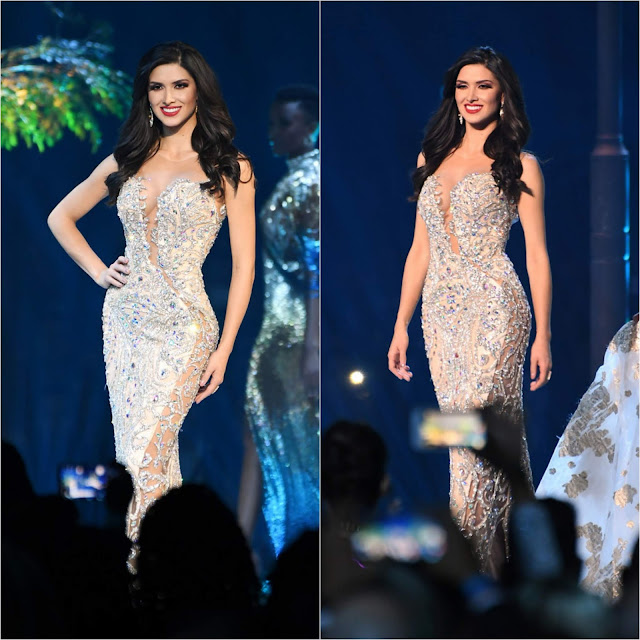 3. Miss Universe Thailand Fahsai Paweensuda Drouin--At first glance when Paweensuda came out, I was like "Oh No She Didn't!" and "Is that a SEQUINED LEG?!" At first, I was a bit confused with my emotions and thoughts on the gown but now, a day after, I really liked it! Designed by SURFACE Adhit Dhirakittiwat, the dress (with one sequined leg), was very stage impacting and certainly stood out among the other nine. It was original in its design and featured gorgeous and very elaborate silver crystal beadwork framing the bodice. One could argue that it was two minutes away from being a costume--for a very High Fashion Moulin Rouge perhaps--but on the Miss Universe stage where you get just ONE CHANCE, Paweensuda went for it, and to me, it paid off.