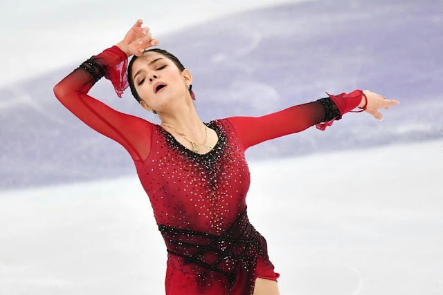 Alina Zagitova Free Skate to Carmen Suite by Rodion Shchedrin--For her Free Skate to (yet another been-there-done-that musical choice!) "Carmen", she wore this red and black costume also featuring lots of crystals. The black lace top came down to the mid-torso, giving a nod to the cropped Spanish Bolero and the skirt was gathered at the side, mirroring what one would see from a Gypsy and her off-kilter garments. The entire look was impacting on the ice but I wished maybe it looked a bit more refined; less beaded lace and less crystals perhaps. It looked a bit Junior-like.