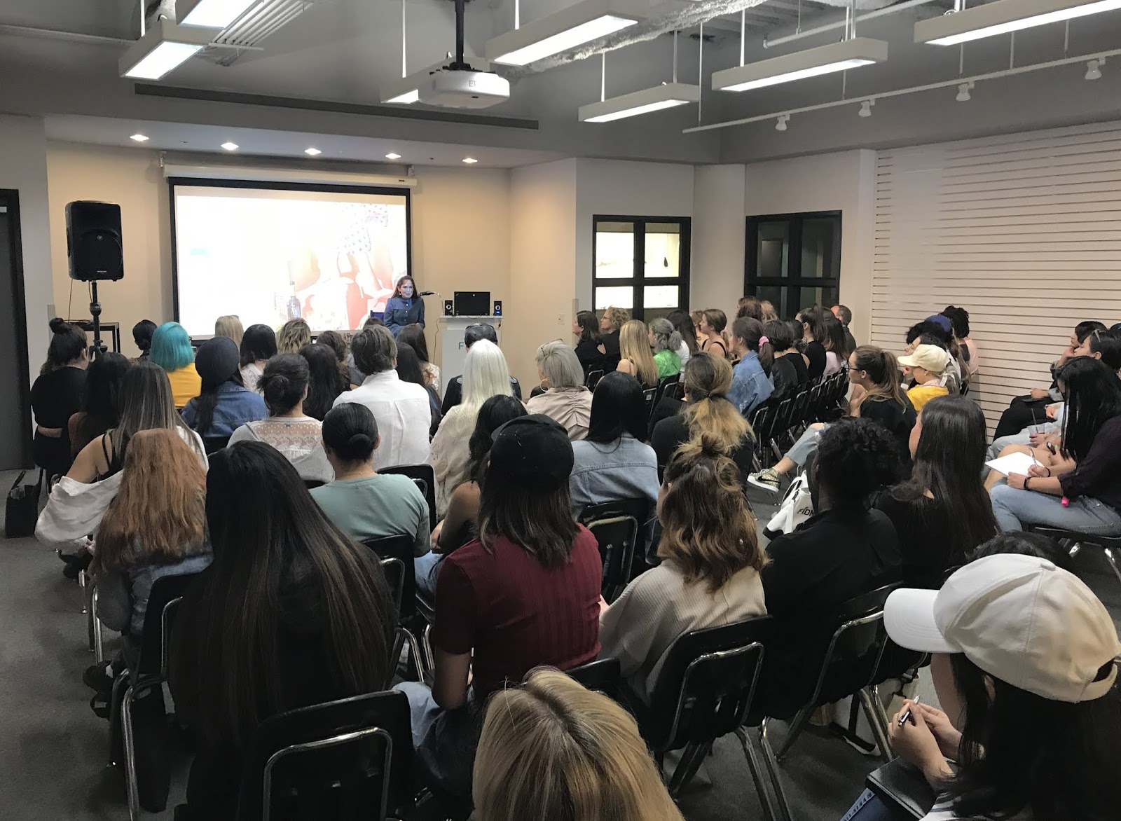 Sarah Flint spoke to a packed room of students, educators, instructors, talking about how she got she got started in the shoe-wear business, designing, and had A-listers such as Meghan Markle, Duchess of Sussex, Amal Clooney wearing her shoes.